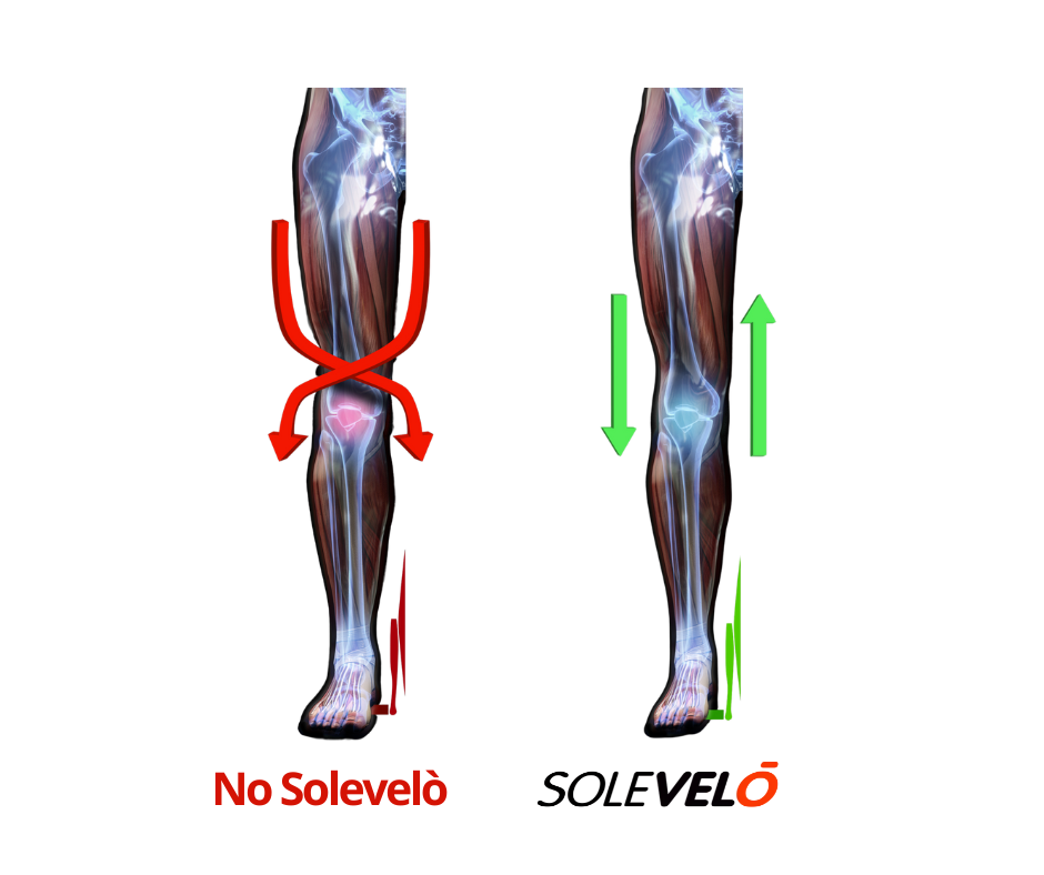 4 ► Solevelò aumenta l'allineamento di caviglia e ginocchio La maggiore stabilità della caviglia abbinata alla conseguente maggior stabilità del ginocchio favoriscono un maggior allineamento delle due articolazioni rispetto alla verticale di spinta sul pedale. Risultato: più spinta meno dispersione.